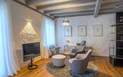Anyone who walks up the dark staircase through the small sandstone-framed door and and sees the candles by the famous lighting designer Ingo Maurer, which are constantly burning under the roof truss, is really curious about what awaits them behind the door to the suite on the second floor...