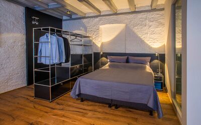 In the historic manor house of the family wine estate founded in 1870, the former residence of the famous Bishop of Mainz Heimes built long before the founding of the wine estate, Christian Ress has created a suite for two people with great attention to detail, where timeless design classics meet old walls. Equipped with original furniture by Ray & Charles Eames, USM Haller, Naoto Fukasawa as well as another luminaire by Ingo Maurer and an Arco luminaire by Achille Castiglioni - the Balthasar Ress-Suite offers an exquisite and an elegant atmosphere for overnight guests with high standards. Also available, of course: an international wine selection in the Gaggenau wine refrigerator with billing according to consumption. Entertainment is provided by the Bang & Olufsen TV and the Marshall music box. The bathroom with rain shower is equipped with Dornbracht fittings. The box spring double bed offers the highest sleeping comfort.